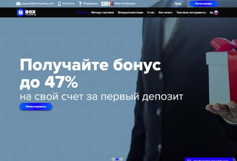 При посещении сайта мошенников BoxInvesting, аферисты Бох Инвестинг пускают в ход анимации с громкоговорящими слоганами о надежности лохотрона BoxInvesting и бонусе на первое пополнение, что в купе со сроком жизни сайта аферистов дает намек на их явную кухонность.