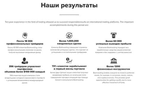 Далее аферисты Бох Инвестинг хвастаются своими достижениями, которые являются очередной выдумкой для наивных лохов, которыми шулера BoxInvesting пытаются привлекать новых клиентов в свою помойку. Данный раздел сайта аферистов Бох Инвестинг вы можете увидеть на изображении ниже.