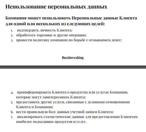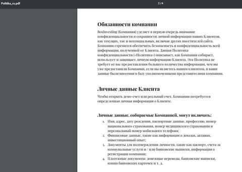 Политика конфиденциальности аферистов BoxInvesting начинается с информации о том, что для открытия счета нужно предоставить все требуемые жуликами Бох Инвестинг данные. А по названия PDF документа политики можно догадаться, что владельцы платформы русскоязычные.