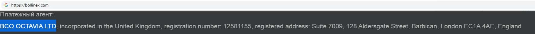 В качестве платежного агента псевдо-брокер BollinEX предоставляет юридическое лицо BCO OCTAVIA LTD, которое якобы находится в Лондоне, столице Великобритании.
