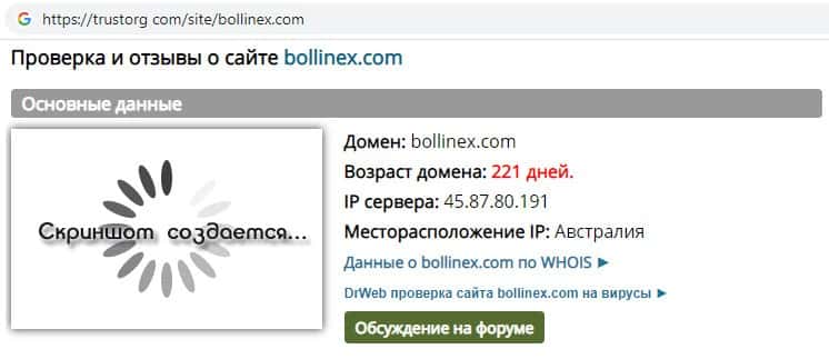 Проверка веб-сервиса лохотронщиков Боллин ЕХ на trustorg com показала, что возраст домена к моменту написания статьи составляет 221 день, скорее всего домен купленный.
