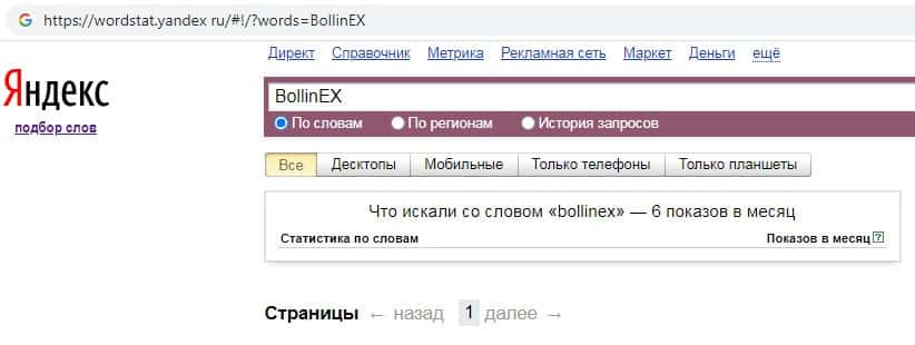 Количество брендовых запросов названия компании на английском языке без пробела "BollinEX" на wordstat yandex ru составляет 6 показов за месяц.