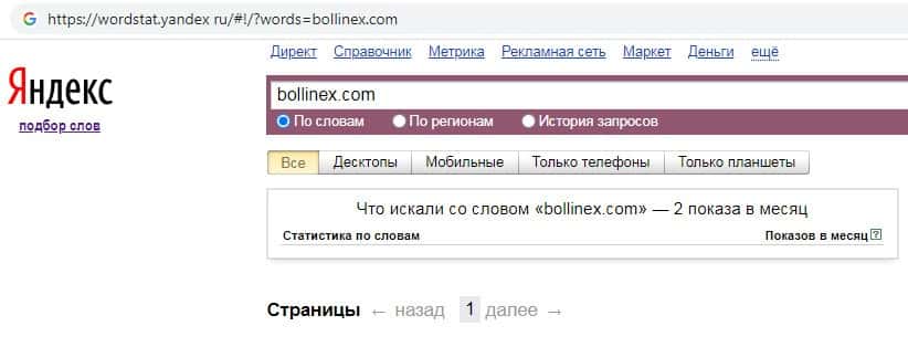 Количество запросов по бренду названия домена компании "bollinex.com" на Вордстарт Яндекс Ру составляет 2 показа за месяц.