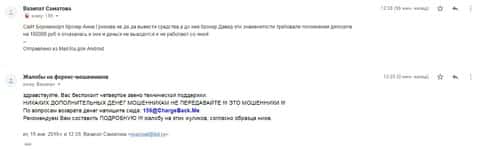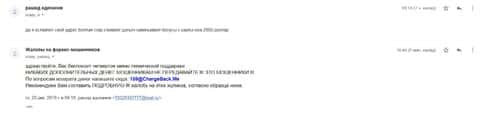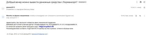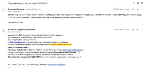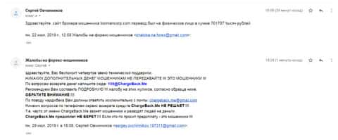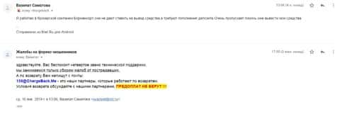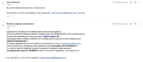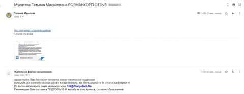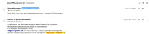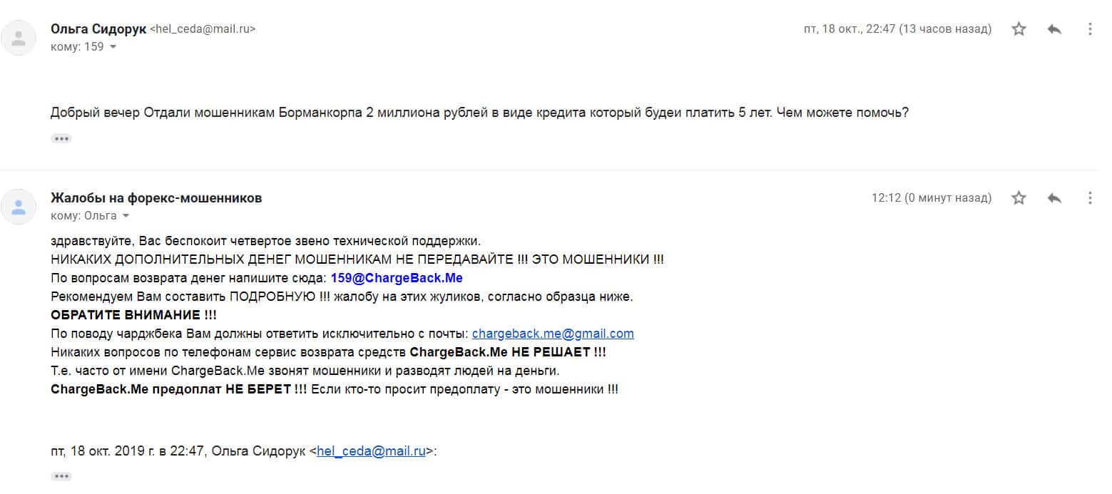 В данном письме человек жалуется на контору Борман Корп, которая обворовала его на 700000 рублей. Мошенники обманным способом уговорили клиента вложить эти деньги, для очень выгодной торговли. Но что-то пошло не так, после перевода средств аферисты перестали выходить на связь. Теперь у него есть надежда только на веб-компанию ChargeBack.Me