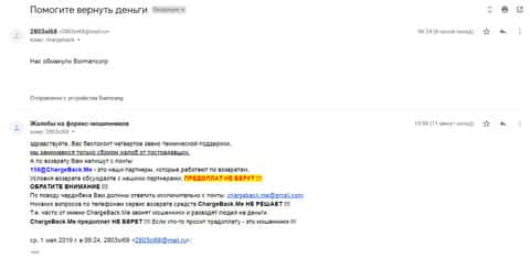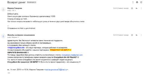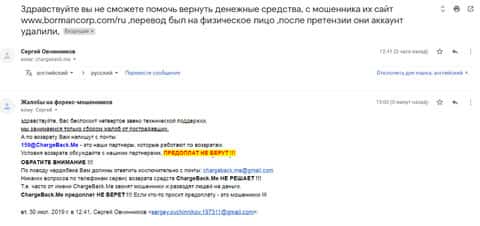 Еще одна наивная женщина решила обратиться в организацию ChargeBack.Me потому что попалась на удочку в форекс-лохотрон Borman. Жулики выманили у нее все сбережения и отказываются теперь не только выводить деньги, а и вовсе прекратили с ней связь. Благо что есть такая компания, где помогают вытащить из лап шарлатанов свои кровно заработанные средства.