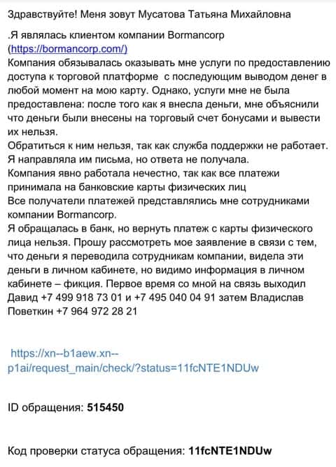 Далее представлена первоначальная жалоба, которую прислала жертва лохотрона Борман.