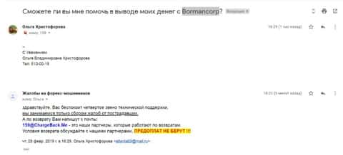К нам пришло письмо от женщины, которая стала жертвой форекс-лохотрона Borman. Мошенники взяли у нее деньги и теперь отказываются выводить прибыль и все вложенные деньги в данную контору. они объясняют это тем, что деньги на счет зачислились как бонусные, а чтобы их вывести нужно заплатить определенную сумму. Она не согласилась на такой развод и стала создавать заявки на вывод и жаловаться в техническую поддержу. Аферисты порвали с клиенткой все каналы связи, поэтому достучаться до них невозможно ни по телефону, ни по почте. Так как деньги были перечислены с карты на карту физических лиц, то и вернуть их невозможно. Да, они отображались в личном кабинете, но это рисовали просто цифры для успокоения клиента.