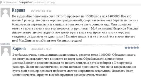 Своими мошенническими клешнями компания-жулик Borman добралась еще до нескольких карманов. Одного человека им удалось уломать на ввод 3 000 долларов на торговый счет и приставили аналитика, который занимался дальнейшим разводом. Там много еще кто работает, это: Александр из финансового отдела, Дарья, Сергей, Владимир и прочие жулики. Вот эта вся бригада звонили по очереди и разыгрывали свой "бюджетный спектакль". После того как человек понял, что уже вляпался и попался на удочку, он захотел сойти с еще целыми деньгами. Но аферисты были подготовлены и попросили заплатить комиссию в размере почти тысячи долларов, чтобы можно было вывести деньги. Другого клиента обрабатывал шулер компании Borman под псевдонимом Платон. Этому удалось вытянуть всего-то 30 000 рублей, но даже за это клиент готов писать заявление в прокуратуру, чтобы найти и расправится с этим жуликом Платоном.