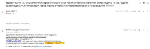 Мошенники форекс-организации Борман опрокинули одну молодую семью, которая доверилась им и вложила не малую сумму денег. Их торговый счет даже не участвовал в торгах, так как люди поняли, что это обман, стоило только заглянуть в интернет. Но было поздно и ставки были сделаны. Все деньги жертвы переводили через систему яндекс-платежей, поэтому будет трудно отследить переводы. Вот если бы это были банковские переводы, то всю ситуацию с возвратом поменяло в корне.