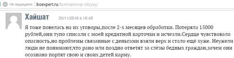 Жулики очень искусно обрабатывали одну женщину, правда длилось это около 2-х месяцев, все же удалось уломать на открытие счета и вложения депозита. Клиентка передала аферистам дилингового центра Borman все свои данные по карточкам и доступу к интернет-банку и они собственноручно сняли 15 000 рублей с кредиткой карты. Женщине очень нужны были дополнительные деньги, но она почувствовала, что что-то неладное случится, но было уже поздно. Шарлатаны совершили несколько операций на счете и все слили под ноль. Теперь она осталась без денег и с кредитом, который при ее заработках пока непосильный.