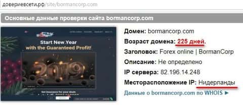 А вот ниже представлены данные о регистрации сайта, а соответственно и основание дилинговой компании Borman. Так вот эта форекс-контора зарегистрирована в этом году, а местонахождения серверов в Нидерландах. Вот так и получается, украдет деньги и ищи ветер в поле!