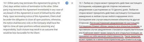 Согласно одному из пунктов Клиентского соглашения, компания или клиент имеет право расторгнуть договор, что является нормальной практикой. Но есть одно НО. После расторжения контракта по инициативе одной из сторон все сделки должны быть закрыты по текущим ценам. То есть когда компании не понравится, что клиент стал зарабатывать или сидит в какой-то потенциально хорошей сделке, аферисты ДЦ Borman могут закрыть все сделки и удалить аккаунт. Кстати, а по поводу возврата средств при закрытии счета никто и слова не промолвил.