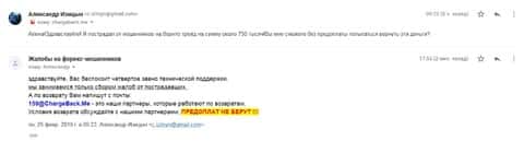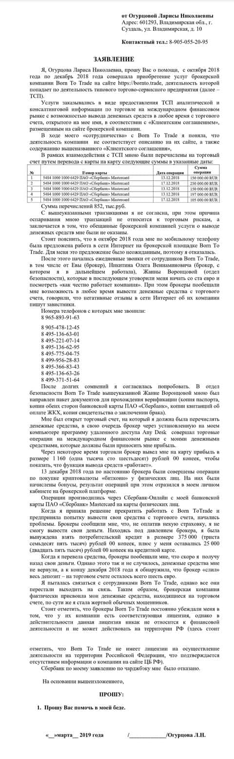 Ниже представлено письмо от пострадавшего от лап мошенников Bornto Trade, который прикрепил в нем развернутое заявление с жалобой на то, что эти жулики обворовали его почти на миллион рублей.