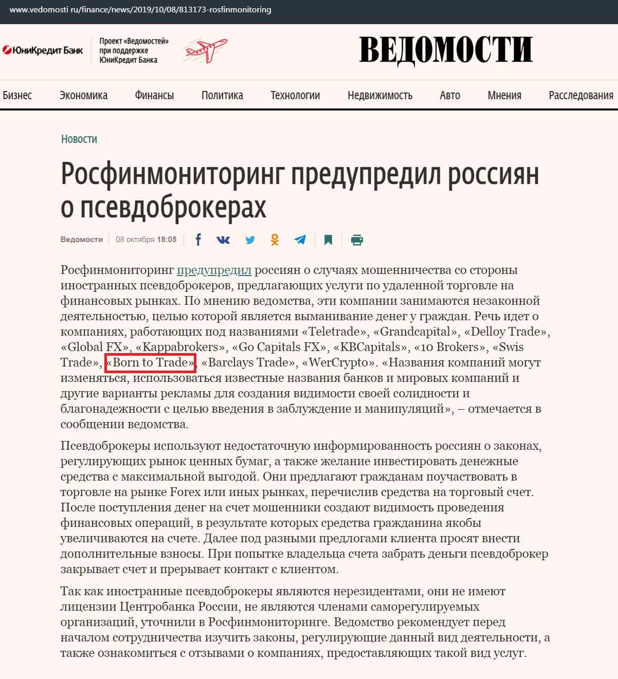 Издание Ведомости опубликовало важное сообщение Росфинмониторинга, где данный орган установил, что на территории России орудует масса мошенников Форекс, в том числе и псевдоброкер БорнтоТрейд.