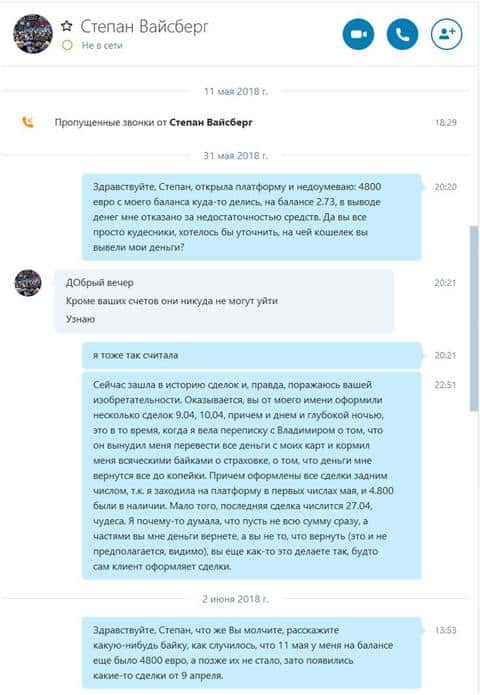 Клиент поделился скайпами мошенников дилинговой кухни Bornto Trade, которые разводили ее на деньги
