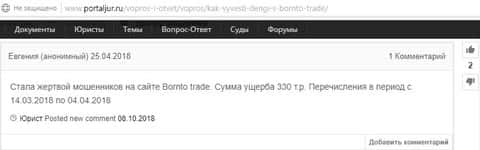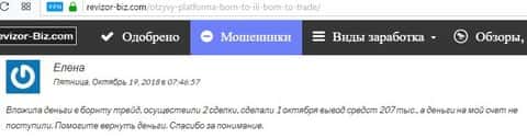 На одном из юридических интернет-порталов нам удалось найти отзыв одной женщины, которая написала жалобу о том, как шарлатаны из дилинговой конторы Bornto Trade развели ее на 330 000 рублей. Жулики работали аккуратно и постепенно. Начиналось все с небольшой суммы, потом просили больше, давали выводить и снова просили. Так и насобиралась такая сумма, при чем все шло в сопровождении положительных сделок. Но когда жертва решила вывести более больший кусок со своего счета, то мошенники мигом заблокировали аккаунт и стали просить вложить еще денег, чтобы его разблокировать. Получилось деньги стали заложниками действий мошенников Борнто Трейд и женщина бьет тревогу и просит о помощи.
