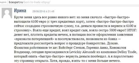 Женщина побила рекорд по потерянным деньгам в брокерской кухне Bornto Trade. Аферисты по-быстрому своими уговорами и обещаниями раскатали недалекую женщину на сумму в размере 6100 евро. При чем денег у нее не было и жулики надавили, чтобы она пошла оформила три кредитные карты. Потом начали говорить о какой-то страховой сумме, чтобы деньги спокойно можно было вывести на счет. Для этого вся семья взяла кредитов еще на 5800 евро и отдала все мошенникам на счет. Теперь никто не отвечает, кредиты уже платить нечем, а банк предлагает начать процедуру банкротства. А это имена жулья, которое участвовало в разводе жертвы: Вайсберг Степан, Горенко Анна, Коновалов Владимир и Левицкий Александр с кухни Delloy Trade, который просит вложить денег в их контору и он поможет вернуть деньги.