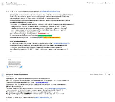 Не всех людей жизнь учит с первого раза, что и случилось в следующей истории, которая произошла с человеком, попавшего сразу в три форекс-конторы. В кухню Свис Трейд он вложил 2400 евро, в контору Борнто Трейд -1300 евро, а в ДЦ DeLloy Trade - 700 евро. Все они кинули его на 240 000 рублей. Чтобы вернуть, ему приходится писать в компанию ChargeBack.Me где обещали помочь с возвратом.