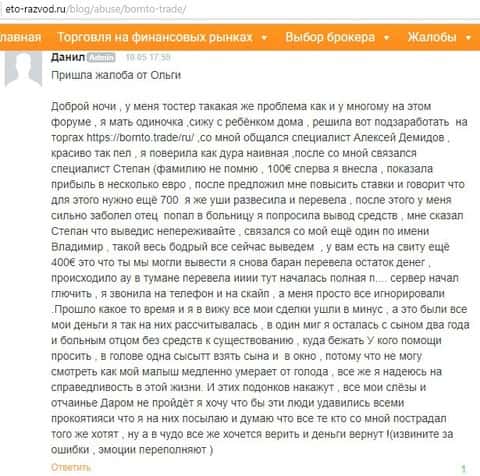 На один из интернет-ресурсов о мошеннических схемах форекс-брокеров пришла жалоба на брокерскую контору Борнто Трейд. Мать-одиночка решила получить дополнительный доход инвестируя часть своих денег. Первым позвонил Алексей Демидов, который предложил открыть счет и дальше общение перевел на специалиста Степана, который развел сначала на 100 евро, а после череды успешных сделок еще на 700 евро. Потом у женщины заболел отец и нужно было срочно вывести деньги, но позвонил жулик Владимир и стал просить еще 400 евро, чтобы можно было вывести деньги без проблем. После перевода этой суммы контора слилась и на звонки и письма уже никто не отвечал. Она зашла на счет и увидела как минусовыми сделками весь депозит был убит. Теперь бедная женщина осталась без денег, с больным отцом и двух-летним сыном, которого она хочет выкинуть в окно, потому что кормить его нечем.
