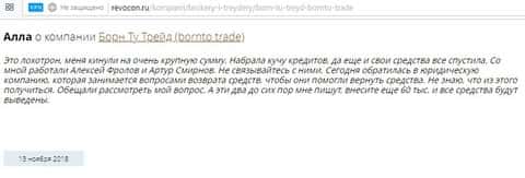 Очередная жертва оставила жалобу на мошенническую организацию Борнто Трейд. Компания обвела вокруг пальца наивную женщину и, войдя в доверие, обобрало на очень крупную сумму денег. Мошенники заставили брать кредиты во всех организациях где только можно. Разводом занимались два звонаря аналитика под псевдонимами Алексей Фролов и Артур Смирнов. Они выманивали деньги постепенно, а потом начали давить и угрожать. После слива всех средств, жулики теперь просят ее 60 000 рублей. Теперь, чтобы вернуть деньги нужно обратиться в юридическую службу по возврату средств, может им удастся помочь вернуть украденное.