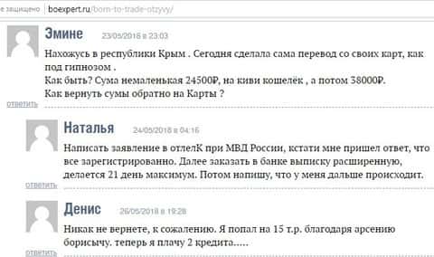 Люди продолжают нести слепо деньги этим мошенникам из дилинговой кухни Bornto Trade. Жулье с радостью принимает его и не отдает. Так попалась одна женщина из АР Крым, которая под цыганским гипнозом перевела на счет мошенников сначала 24 500 рублей, а потом 38 000 рублей, естественно они их быстренько слили, а женщина теперь только надеется, что кто-то поможет вернуть украденное. А другую жертву заставили пойти взять кредит на 15 000 рублей и слили тоже все подчистую. Человек убивается от горя, ведь для него это большая сумма, да еще и в кредите. И чем они только руководствовались, когда контора просила деньги. Так можно сказать, пойдите спрыгните с моста и они пойдут. Стадо!