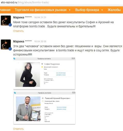 На одном из сайтов о форекс-мошенниках одна женщина оставила отзыв о брокере Борнто Трейд. Она была клиентом данной организации, которая развела ее на очень крупную сумму денег. Шарлатанскую схему раскатывали через связь скайп два афериста под псевдонимами София Андреевна и Раевский Арсений Борисович. Предпочтительно они работают в соцсетях, где вылавливают своих жертв. Для того, чтобы предупредить остальных людей, желающих вложить деньги в эту кухню, оно оставила скриншоты с данными скайпов мошенников, которые причастны к этой афере. Берегитесь этих жуликов, иначе станете такой же жертвой обмана как и она.