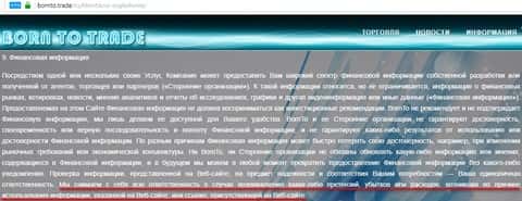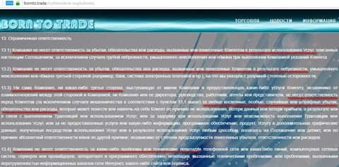 Мошенническая организация Борнто Трейд составила такой договор, что в случае потери депозита клиента по из вине, они нести ответственность не будут. Согласно одному из разделов документа они не несут ответственность за всю информацию, которая расположена на сайте и, если она принесла убытки, то жулики не причем. Получается, что сюда входит и сам договор и условия торговли. Так что по закону не подкопаешься, не нужно было подписывать.