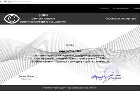 Липовая комиссия контроля и регулирования финансовых рынков CCRFM выдала лицензию брокерской конторе Борнто Трейд, которая не имеет никакой юридической силы ни в какой стране. Это просто фикция, которую придумали мошенники, объединившись между собой и создали себе регулятора, который выдает разрешение на ведения деятельности любому брокеру-аферисту, заплатившему деньги. Лохотрон теперь машет этим документом и лохи, открыв широко рот, несут деньги один поперед другим. Будьте умнее и не давайте конторе отобрать у вас все что вам дорого!