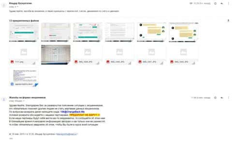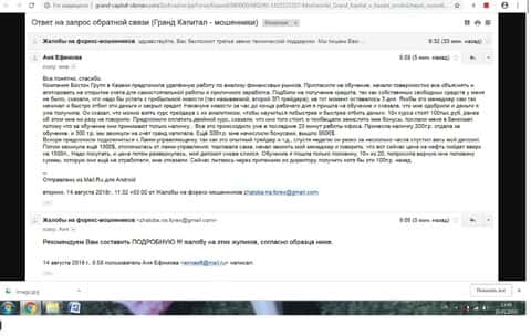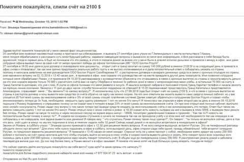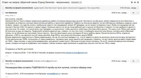 Всю эту документацию жертва приложила в письме, приведённом ниже. Всё это было сделано с одной целью – предостеречь остальных пользователей от связи с мошеннической шайкой Гранд Капитал и Бостон Груп, которые нещадно разводят своих клиентов на деньги, прикрываясь торговлей на Форекс и валютных рынках.