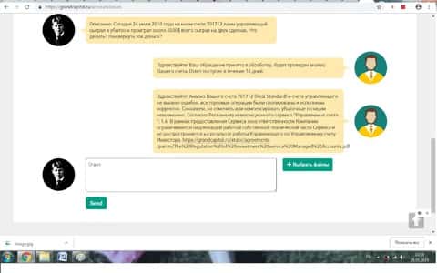 Далее представлена переписка жертвы жуликов Бостон Груп с поддержкой тех самых их партнёров Гранд Капитал. Переписка, как видите, не сулит клиенту ничего хорошего. Этого, в принципе, и стоило ожидать. Деньги клиента были слиты вообще без его ведома, однако всю ответственность повесили именно на него, мол, отдувайся теперь как хочешь.