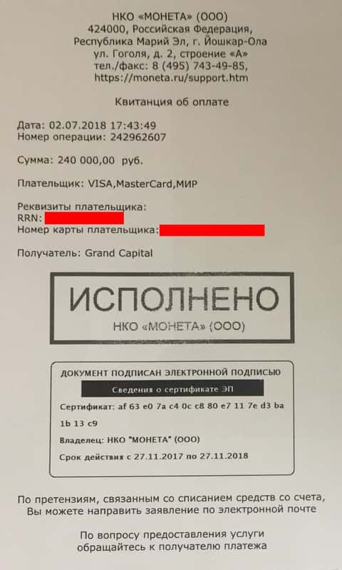 А вот скрин квитанции об оплате 240 тысяч рублей. Переведены же деньги были на сайт жуликов Гранд Капитал, прямых партнёров Бостон Груп, где эти самые деньги был успешно слиты, а всё ответственность, как вы видели выше, перекинута на клиента.