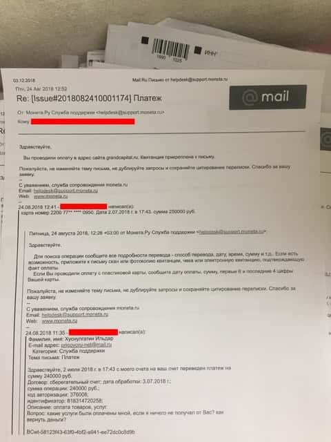 Письмо от сервиса монета ру, через который осуществлялся перевод на счёт Гранд Капитал клиентом денег. Эти самые Grand Capital пляшут под дудку BostonGroup, если это не одни и те же люди, которые нагло разводят своих клиентов на огромные суммы денег, оставаясь при этом вне правового поля.
