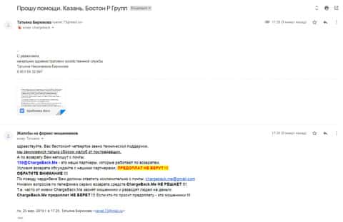 Еще один случай произошел с женщиной в городе Казань, которая повелась на вакансию начальника офиса в контору BostonrGroup, где пообещали ей 100 000 рублей зарплату и комфортные условия. Но по итогу аферисты вытащили у нее порядка 5000 долларов, которые и слили за несколько дней. Чтобы вернуть средства, сестра попросила ее написать жалобу в компанию ChargeBack.Me где давно уже с ними воюют и достаточно успешно.