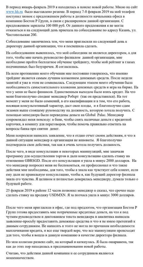 Далее представлена письмо, в котором потерпевшая расписала все подробности мошенничества со стороны аферистов Бостон Груп.