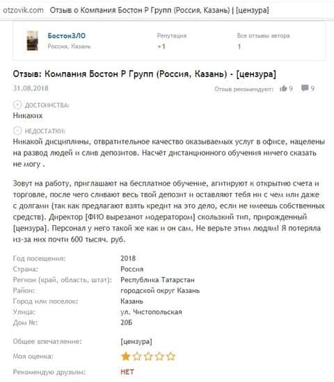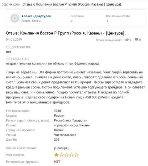 На просторах Всемирной Паутины, не смотря на большое количество покупных фейковых отзывов, можно найти и вполне реальные, например, на сайте отзовик ком, на котором, как вы можете знать, модераторы тщательно отбирают отзывы и туда не могут пробиться засланные казачки BostonGroup со своими покупными фейковыми отзывами. Сами же отзывы только подтверждают вышеприведённые жалобы, Бостон Груп – лохотрон чистой воды.