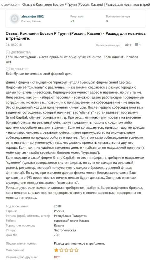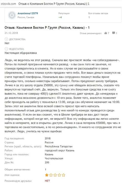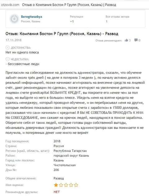 Еще один отзыв на сайте отзовик ком о слитых 450 тысячах рублей подтверждает связь BostonGroup с мошенниками Гранд Капитал, в которую аферисты сливают своих клиентов. Названия самих контор значения не имеют, ведь эти названия сменить легко, но суть остаётся одной и той же - бессовестный развод людей по всем странам СНГ на огромные деньги, при чём на самих клиентов злоумышленникам Бостон Груп плевать с высокой колокольни.