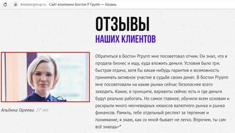 Сама мошенническая натура BostonGroup проявляется прямо на сайте этих мошенников. Например, в разделе отзывов указана некая девушка-сотрудница данной конторы, оставившая сайт якобы на сайте о сотрудничестве с Бостон Груп, и, конечно же, всё описано в лучшем виде. Однако все эти иллюзии развеиваются, если пробить фотографию данной девушки через Гугл.