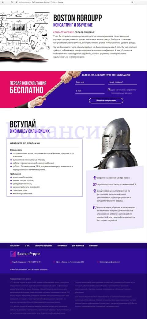 Дальше по сайту BostonGroup мы видим продолжение темы о помпезных выражениях и обещаниях больших заработков. Написано грамотно, и ,не зная всей подноготной, вполне можно повестить. Надеемся, после нашей статьи все сомнения у вас касательно причастности конторы Бостон Груп к разряду мошеннических отпали. Самое страшное, что у этих аферистов есть офис, и они почти что официально, в федеральном масштабе, разводят людей на деньги, и никакого наказания за это не несут, прикрываясь тем, что они "консалтинговая компания".
