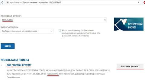 К счастью, в случае с руководством, мы способны выудить некую информацию со Всемирной Паутины, воспользовавшись ИНН (Идентификационным номером налогоплательщика) конторы Бостон Груп, найденным на одной из квитанций, данных в приложении к первоначальной жалобе. Так, этот ИНН – 1655368870. А чтобы узнать о самой конторе BostonGroup, стоит просто вбить этот номер в поиск по ЭРГЮЛ (Единому государственному реестру юридических лиц).