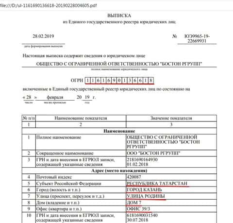 Нажав кнопочку Получить выписку, мы можем видеть основные данные о конторе Бостон Груп. Мы можем видеть также ОГРН (Основной государственный регистрационный номер), и юридический адрес Татарстане, который, понятное дело, не совпадает с фактическом адресом этой конторы в городе Казань.