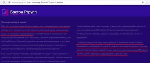 Как уже говорилось, любую ответственность за ваши потери жулики BostonGroup полностью отрицают. Далеко идти не надо, эта самая информация, красуется на главной страничке сайта, правда в самом низу, чтобы клиент не понял, в какой капкан он втягивает себя и свои финансы. Не смотря на то, что аферисты Бостон Груп в 100% случаев и являются причиной материальных бед своих клиентов, позиционируют они себя как консалтинговую контору, и как итог, снимают с себя любую ответственность за потери и поломанные судьбы своих клиентов.