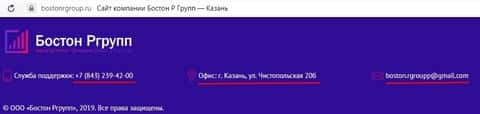 На сайте BostonGroup, плюс ко всему, размещены данные об офисе данной конторы. Находится этот самый офис в городе Казань. Так же имеются телефон поддержки и электронная почта. Ответят же они вам, при случае, не скоро, если вообще ответят Вот эти самые контакты о мошеннической конторе Бостон Груп, как и было сказано, не совпадающие с её юридическим адресом, который скорее всего, уже давно пустует: