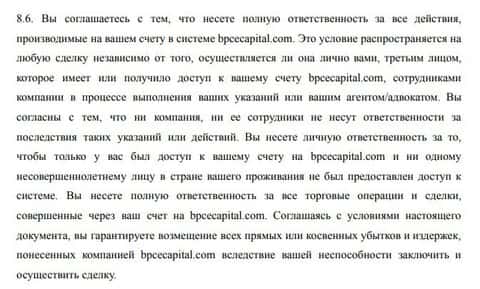 Согласно тому, что аферисты пишут в соглашении, скам-компания BPCE Capital не несет никакой ответственности за не полученную прибыль клиентом, а также за возможные убытки.