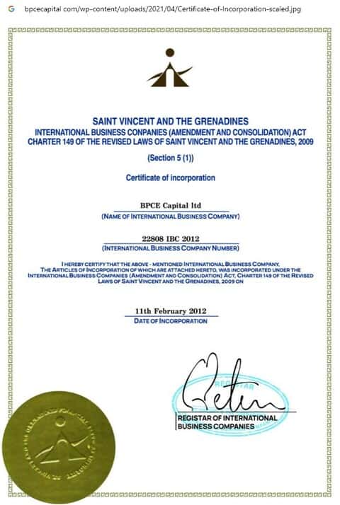 Перейдя по указанной ссылке на сайте мошенников BPCE Capital можно увидеть сертификат о регистрации конторы в оффшоре, который наверняка липовый.