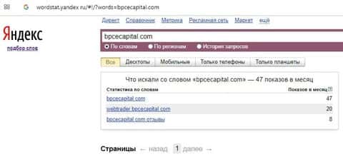 Количество запросов по бренду название домена компании "bpcecapital.com" на wordstat yandex ru составляет 47 запросов за месяц.