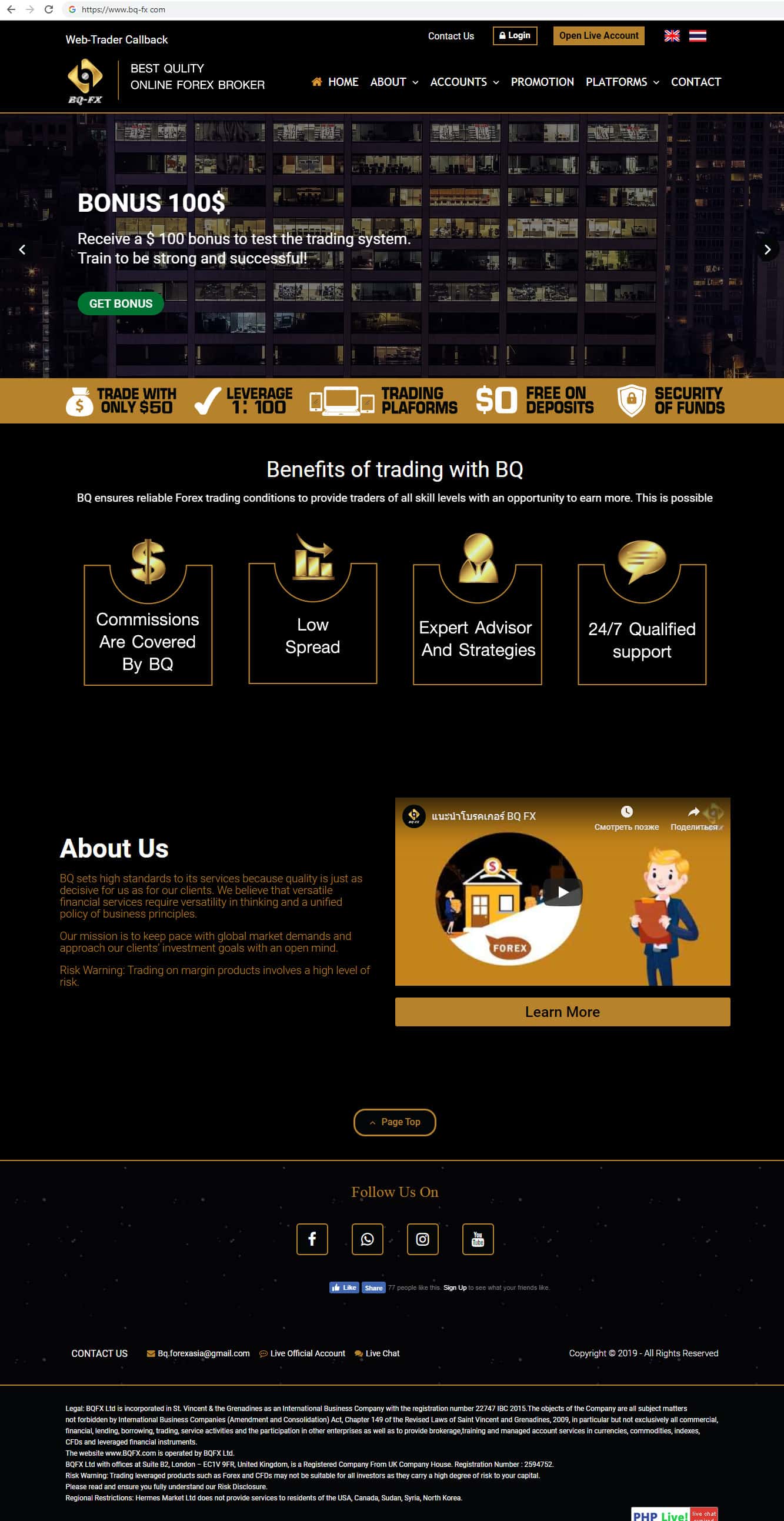 Сайт жуликов БиКью ФХ полностью на английском языке. В принципе стандартный брокерский сайт с обещаниями клиенту, что именно у них на сайте можно получить немалую прибыль.