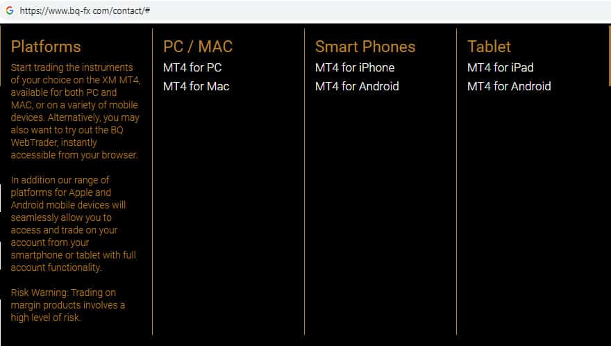 На официальном сайте мошеннической компании БиКью ФХ пре длагается клиенту начать торговать различными инструментами по выбору, уведомляя о том, что торговля доступна на персональном компьютере или на различных мобильных устройствах. Так же есть возможность торговать со смартфона или планшета, что обеспечивает полный доступ к данным учетной записи клиента шуллеров БиКью ФХ.