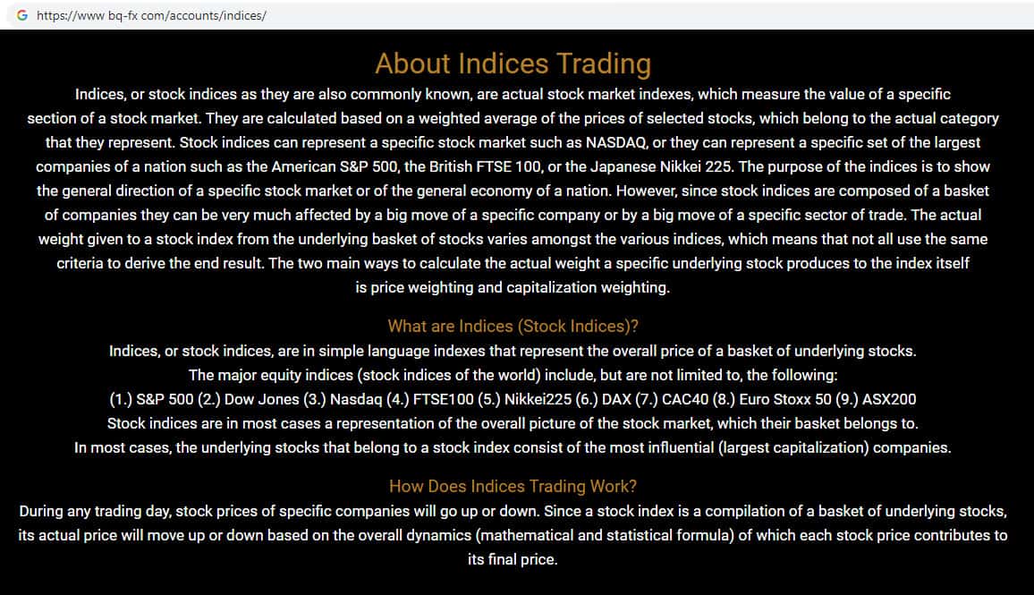 О торговле индексами скам-брокер БиКью ФХ разместил на своем сайте только лишь информацию об определении торгового индекса, фондового индекса. Особо не заморачиваясь мошенники разместили информацию для пользователей, которые по их мнению не знают определений терминов.