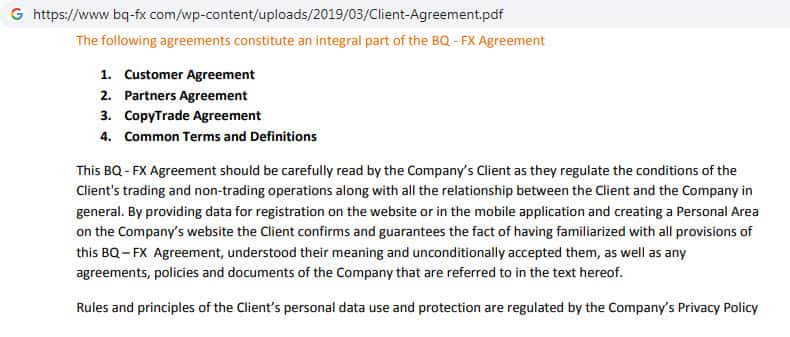 Информации о регистрации на сайте скам-брокера БиКью ФХ не имеется, и о лицензии к стати тоже. Зато имеются торговые документы мошеннической организации БиКью ФХ о клиентском соглашении, политике конфиденциальности и предупреждении о всевозможных рисках.