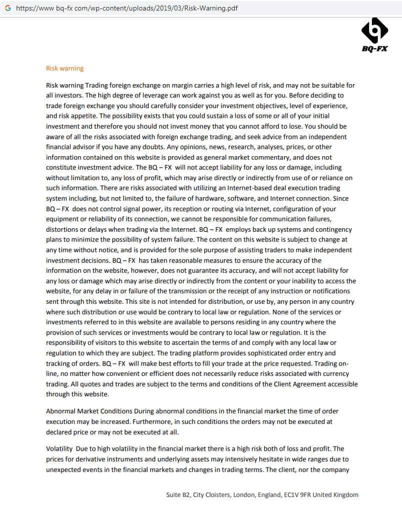 На официальном сайте скам-брокера БиКью ФХ имеется информация о всевозможном риске потери средств клиента в зависимости от обстоятельств.Торговля на маржинальных продуктах сопряжена с высоким уровнем риска. Это значит, что очень велик риск потерять все вложенные средства в торговлю на сайте брокера БиКью ФХ.